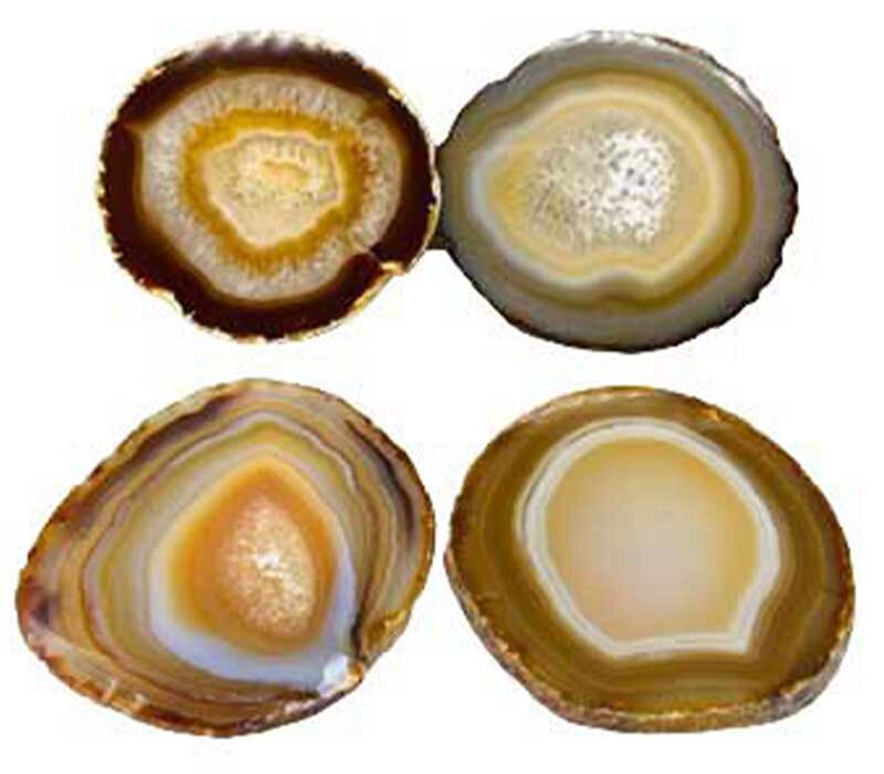 This is a set of 4 Agate slices that have a variety of uses. Perfect as a powerful altar tile or impress your next guest by using them as coasters! Set of four come in a variety of colors, sizes and inclusions. Each tile is unique and comes with adhesive buttons to put on the bottom to protect your Agate and surface. Approximately 4" wide with varying colors of black, blue, red, orange and more. From Brazil