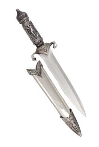 This athame displays a winged goddess on its pewter sheath, which perfectly accents the scrollwork and goddess that compose the athames ornate hilt. Cannot ship to MA or CA. 13" - 8" blade.