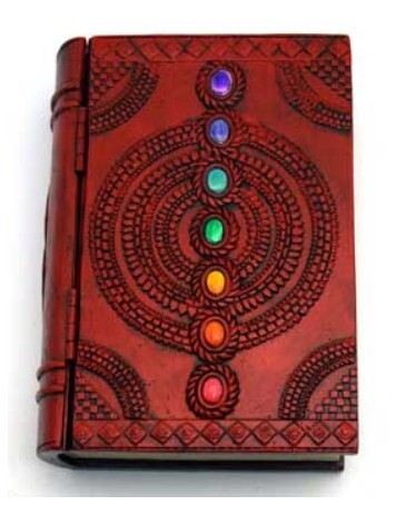 Store your trinkets in this faux journal that is actually a box! This charming box is made of cold cast resin with hinges that open the box, imitation gold paper along the sides, and a 7-chakra stone on the top. Faux book boxes are not only incredibly charming accents, but they are functional too. An attractive storage option, with the look of a leather embossed journal; hide your precious keepsakes in plain sight. This box is 4" wide x 6" long x 2" deep.