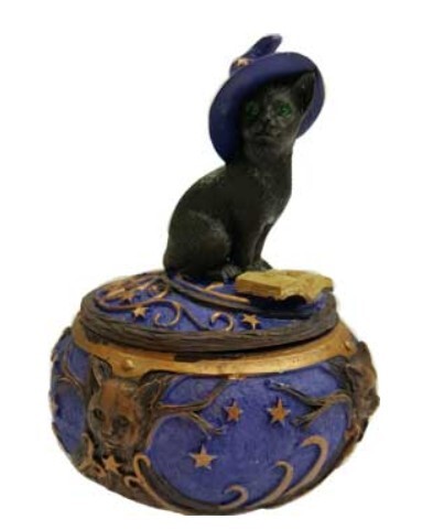 This magical little jar displays a black cat, sitting atop its lid seemingly looking up from reading a magical tome; a wonderful place for storing your jewelry and magical tools. 5”