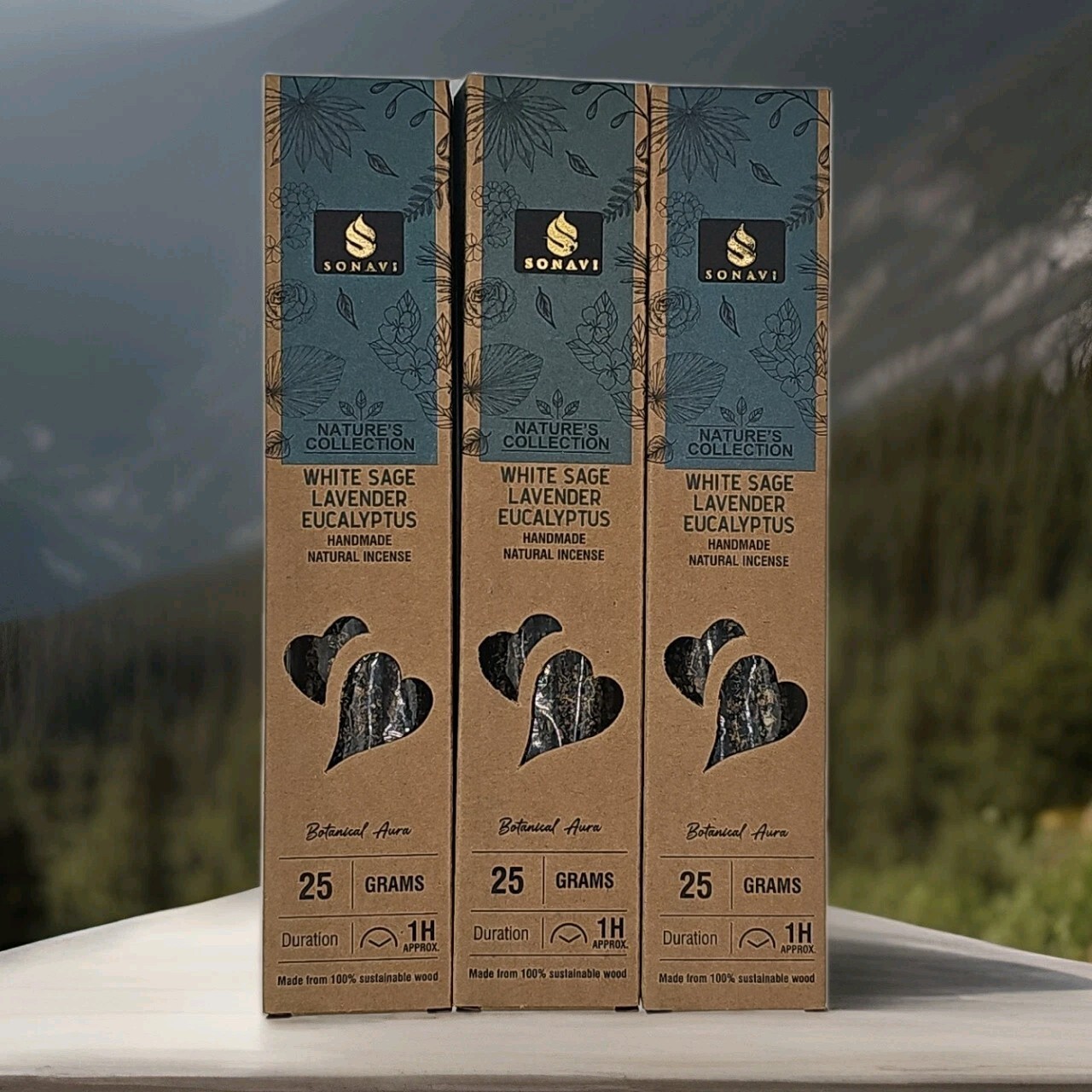 3 Boxes of Sonavi Premium Handcrafted White Sage, Lavender, Eucalyptus Incense Sticks. 25gm per box.